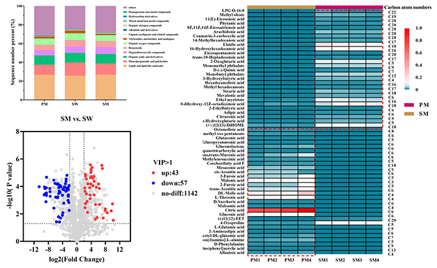 非靶向代谢组学分析共鉴定出1242种代谢物。在扁蓿豆植株甲醇提取物中,短链有机酸及其衍生物的相对丰度较高;根际土壤水提物中富含生物碱和黄酮类化合物;而根际土壤甲醇提取物则以长链有机酸及其衍生物为主。进一步发现,短链有机酸、其衍生物以及黄酮类化合物可能为与扁蓿豆化感作用相关的关键候选化感物质。