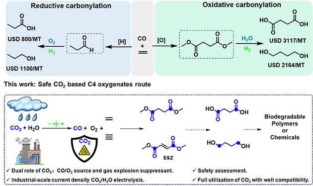 在此前氧化羰基化研究的基础之上(Science,2024,386: 776-782;Angew Chem Int Ed,2020,59: 2080-2084;ACS Catal.,2023,13: 735-743;ChemSusChem,2022,15: e202102400;分子催化,2020,34,182–192;2024,38,297–308),研究人员通过一种CO2全利用策略,将CO2-H2O共电解生成的CO/O2作为原料,与乙烯/乙炔的氧化双羰基化合成CO2基C4双酯类化合物,如丁二酸二甲酯、富马酸二甲酯和马来酸二甲酯等,这类化合物在可降解聚合物(聚丁二酸二丁酯)、增塑剂、溶剂、表面活性剂、有机合成中间体等多个领域内有着广泛的用途。与传统的烯/炔烃羰基化相比较,烯/炔烃氧化羰基化能同时插入两个羰基,生成更有价值的化学品。此外,尚未电解的CO2可作为气体抑爆剂,可消除或降低乙烯/乙炔氧化双羰基化反应过程中潜在的爆炸风险。
