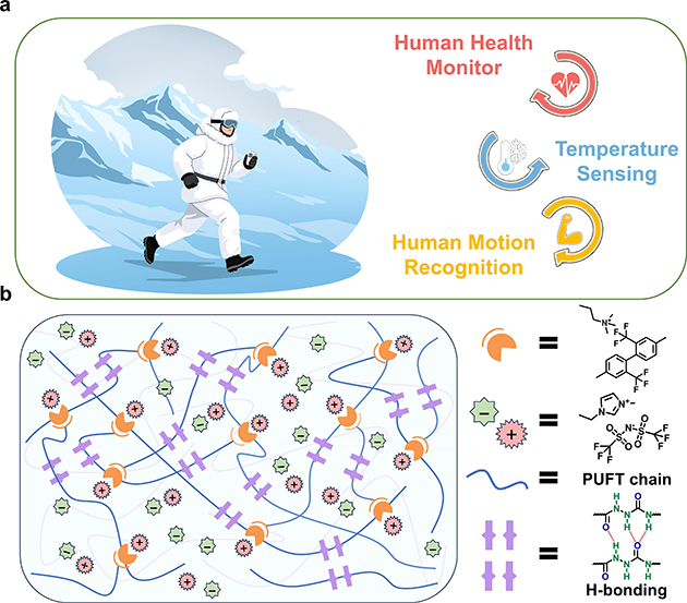 为探索聚氨酯材料的应用潜力,基于上述研究,研究人员对聚氨酯材料内部分子网络设计和功能化进行深入研究。为实现材料的导电性,引入更多具有额外极性的极性键是一种可能的策略,如碳-氟(C-F)键。由于F原子的高电负性,C-F键的强静电性质会增强进入体系的电子极性,这样阴离子和阳离子可彼此分布得更远,在聚合物内部移动更自由。基于此,研究人员提出了一种分子工程范式,利用氟的双重功能在聚氨酯基质中构建空间相关但功能独立的动态网络。通过引入含氟扩链剂和多氢键单元,构建了氟-阳离子相互作用与高密度氢键协同的动态网络,氟的高电负性不仅与封端剂形成离子键增强网络稳定性,还通过偶极相互作用固定阳离子,构建阴离子传输通道,保障离子高效迁移。从而成功制备了一种具备超敏感多参数监测功能,可用于极地可穿戴设备形状记忆聚氨酯材料。