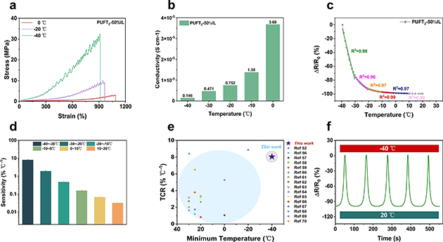 针对极地等极端环境的挑战,团队重点测试了材料的低温耐受性。在-40℃时,材料仍能保持较高的强度、韧性、可拉伸性和离子电导率。此外,该材料表现出负温度系数行为,在-40℃至-30℃超低温区间的温度系数电阻高达8.05% ℃-1,且在连续热循环测试中表现出良好的稳定性和可重复性,彰显了其在深冷环境下可靠应用的潜力。