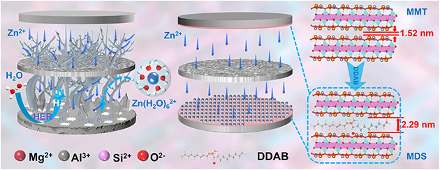 在上述研究工作基础上,为进一步拓宽Zn2+的传输通道、实现“亲锌疏水”和Zn(002)晶面沉积的有效调控,研究团队通过双十二烷基二甲基溴化铵(DDAB)插层MMT成功制备出MDS改性黏土矿物材料,并将其均匀涂覆于锌箔表面构筑出MDS@Zn复合阳极。研究结果表明,MDS涂层不仅能够有序引导Zn2+传输、促进(002)晶面择优沉积,且能有效阻隔电解液与锌负极之间的直接接触,继而显著抑制锌枝晶生长、析氢反应及腐蚀副反应。DFT计算证明,MDS对Zn2+、H2O和SO42–表现出更强的吸附能,进一步验证了其优异的电化学界面调控能力。电化学研究表明,MDS@Zn对称电池在2mA cm–2和1mAh cm–2条件下可实现超过3620小时的稳定循环,在5mA cm–2的高电流密度下仍能连续运行3800小时。MDS@Zn||Cu半电池在1mA cm–2和1mAh cm–2条件下循环3600小时后,平均库仑效率高达99.5%。此外,基于MDS@Zn负极与VO2正极构建的全电池在2.5A g–1下经历1300次循环后,容量保持率仍达95.5%,展现出优异的循环稳定性和应用前景。