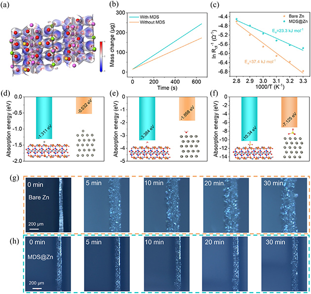 图3. (a) MDS的静电势(ESP)分布图。(b) 电化学石英晶体微天平(EQCM)测试中,有无MDS层时电镀过程的质量变化图。(c) 基于电荷转移电阻计算的裸锌和MDS@Zn阳极的活化能。(d)、(e)、(f) 分别为Zn2+、H2O和SO42–在裸锌和MDS阳极(002)晶面上的吸附能图。(g) 裸锌阳极和 (h) MDS@Zn阳极在10mA cm–2电流密度下锌沉积过程的原位光学显微镜图像。