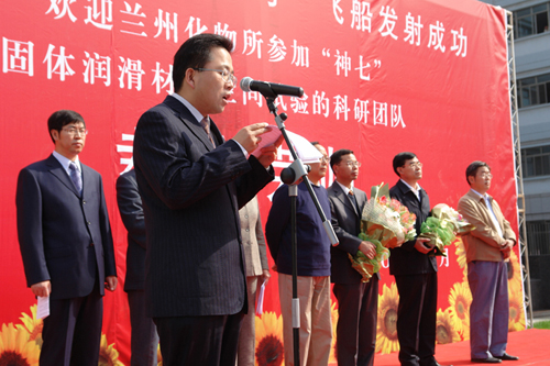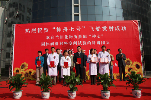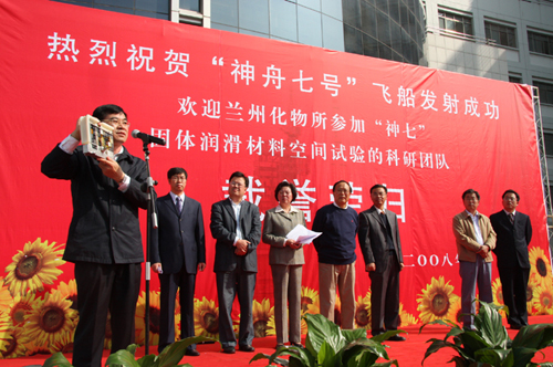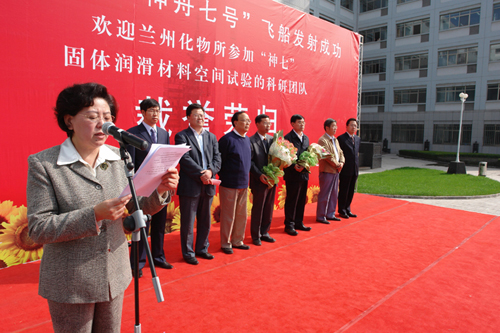 9月28日下午,中国科学院兰州化学物理研究所举行隆重仪式庆祝“神舟七号”载人飞船发射成功,欢迎“神舟七号飞船应用系统固体润滑材料空间试验”的科研团队载誉荣归。兰化所党委书记兼副所长致欢迎词并宣读表彰决定。兰化所副所长王齐华、兰州分院副院长杨青春分别宣读了全国人大常委会副委员长、中科院院长路甬祥和兰州分院的贺信。兰州分院党组书记、副院长王学定、薛群基院士、刘维民所长、翁立军研究员分别在会上讲话。兰化所所长助理师彦平研究员主持了会议。研究生代表为载誉归来的科研人员代表献花。全所职工和研究生同学参加了会议。