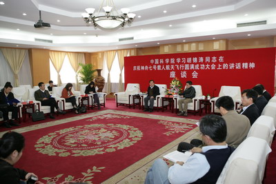 11月7日上午,党中央、国务院、中央军委在人民大会堂隆重举行庆祝神舟七号载人航天飞行圆满成功大会,下午,中国科学院举行了学习胡锦涛同志在庆祝神七载人航天飞行圆满成功大会上的讲话精神座谈会。