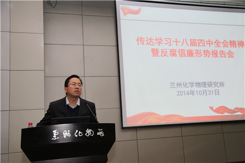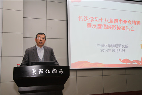 10月31日,中国科学院兰州化学物理研究所召开专题会议,传达学习党的十八届四中全会和十八届中央纪委四次全会精神,开展反腐倡廉形势教育。会议由兰州化物所所长夏春谷主持,党委书记、副所长兼纪委书记王齐华、副所长师彦平、所长助理兼监察审计室主任张长春及两委委员、党支部书记和全所干部职工参加了会议。