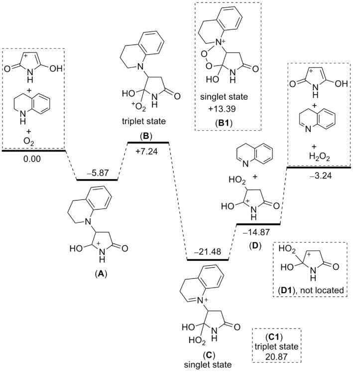 FT-IR、Uv-visible、GC-MS示踪和DFT计算等研究表明聚合物催化剂中羰基-羟基循环结构确实为该催化剂的活性位点,整个催化反应经历了四氢喹啉加成到马来酰亚胺的烯烃双键、氧分子活化、选择氧化生成氧化产物、羰基再生这一循环过程。