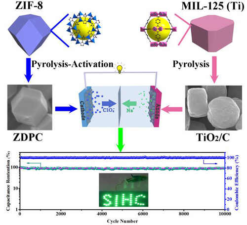 近日,中国科学院兰州化学物理研究所清洁能源化学与材料实验室阎兴斌研究员团队利用新型金属有机骨架(MOFs)材料开放的孔道结构、高的比表面积和可调控的结构,从MIL-125(Ti)和ZIF-8入手,成功制备了结构稳固并兼具快速动力学特征的TiO2/C纳米复合负极材料和具有高比表面积的3D分级纳米多孔碳ZDPC正极,在NaClO4/EC-PC有机电解液体系,成功构筑了高性能新型钠离子混合电容器。