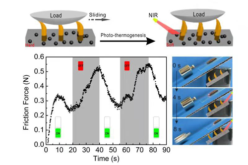虽然实现了麦芒的仿生制造,但如何从被动走向主动、实现摩擦各向异性的动态调控始终困扰着研究人员。仿生麦芒上倒刺倾斜角度是死的,不能自由活动,这意味着定向迁移是不可逆的,制备出的器件面临着易进难退的问题,怎么办?针对这一问题,研究人员结合材料模量调控,设计构筑了基底强度和表面倒刺取向角度可动态调节的各向异性仿生表界面材料,初步实现了仿生取向结构表界面各向异性摩擦行为的智能调控。如图2所示,研究人员采用转移复制的方法,将3D打印得到的取向性倒刺结构埋植于加了光热Fe3O4纳米粒子的PLA基底中,NIR照射下光热Fe3O4纳米粒子生热导致基底材料软化,其表面取向性倒刺在载荷动态作用下角度可原位发生改变,从而引起正反两个方向的摩擦力差异发生显著改变,实现了仿生表面各向异性摩擦行为的动态调控。这种光热响应的摩擦各向异性材料可被用作智能开关,实现物件在斜坡或垂直方向的可控释放。该研究工作近期发表在Adv. Mater. Interfaces 上(Adv. Mater. Interfaces, 2018, 1801460),论文第一作者是兰州化物所博士生姬忠莹,通讯作者兰州化物所王晓龙研究员.