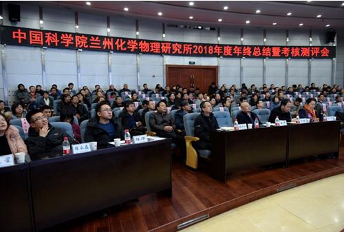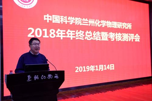 1月14日上午,中国科学院兰州化学物理研究所召开2018年度工作总结暨领导班子和党建工作述职考评会。按照中国科学院对研究所领导班子及领导人员年度考核工作的统一部署,中科院兰州分院副院长、分党组成员吴建刚,兰州分院党组成员、纪检组长宋文辉,中科院近代物理研究所党委副书记、纪委书记袁平,中科院西北生态环境资源研究院党委书记、副院长冯起,兰州分院组织人事教育处、党建与监察审计处负责人与相关工作人员组成考核组,对兰州化物所领导班子和领导人员、以及党建工作情况实施现场考评。兰州化物所领导班子成员、党委委员、纪委委员、学术委员会委员、职代会常设主席团成员、中层领导人员、副高以上专业技术骨干人员、党支部书记、民主党派人员代表、离退休人员代表等以及各类职工代表200余人听取了报告并进行了现场评议。会议由吴建刚主持。