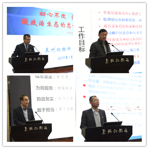 兰州化物所所长、党委书记王齐华代表研究所领导班子作工作总结,从2018年改革创新举措与重要进展、代表性科研工作、平台建设与条件保障、存在问题和未来工作思路等5个方面,介绍了研究所2018年主要工作。兰州化物所副所长赵培庆、周峰和张俊彦分别就各自分管工作进行述职。党建述职评议环节,王齐华作党建工作总结,从7个方面介绍了2018年度党建工作情况,总结了存在的不足,部署了下阶段重点工作。兰州化物所党委副书记、纪委书记张长春作了纪委书记述职报告。听取述职后,全体与会人员对党政领导班子2018年度工作进行现场评议。