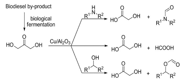 进一步研究发现,在甘油酮氧化断键生成乙醇酸时可生成一分子的甲酸,而由于甲酸进一步被氧化为二氧化碳,导致甲酸的收率只有41%。为了提高甘油酮中碳的利用效率,研究人员通过加入胺或醇将这一分子碳成功转化为甲酰胺或者甲酸酯且获得了90%以上的收率。与此同时,乙醇酸的收率和双氧水的利用率也都达到90%以上,从而实现了甘油酮中碳的完全利用。
