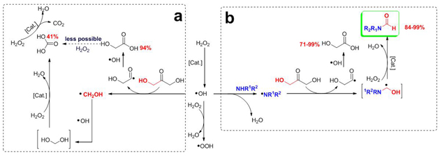研究人员对反应过程进行原位顺磁共振(In-situ EPR)研究发现,在催化剂Cu/Al2O3存在下双氧水产生HO·O2·自由基,然后HO·自由基进攻甘油酮发生反应。原位红外(In-situ ATR-IR)表征发现,随着甘油酮催化氧化反应的进行,乙醇酸和甲酸同步生成。当第二组分胺加入到反应中时,HO·自由基与胺反应生成胺自由基并进一步与甘油酮反应直接转化为甲酰胺。