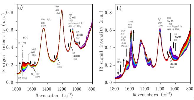 典型的原位ATR-FTIR谱图(a)乙醇酸和甲酸合成和(b)乙醇酸和甲酰胺合成