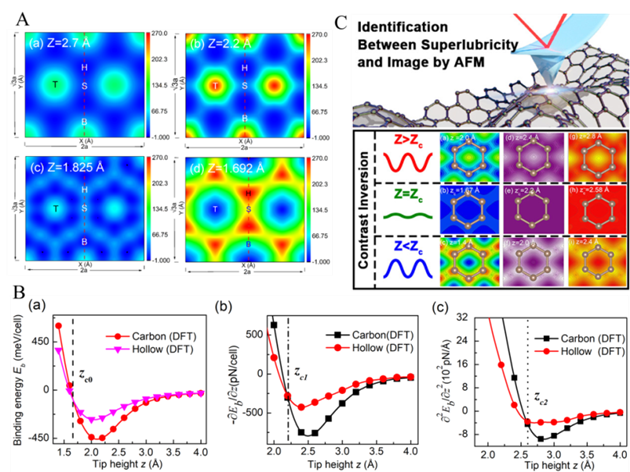势能面起伏的反转在能量曲线上表现为交叉行为(图B, 来自Sun et al.J. Phys. Chem. Lett.2019, 10, 1498-1504),表明在滑移路径上相邻位点的能量存在绝对相等,即预示了理论上的滑动能垒起伏为零。进一步研究了原子力显微镜实验中探针在碳纳米材料表面的滑动行为,通过论证势能面起伏、表面化学力和样品原子力显微镜图像反转之间存在的内在关联,对压力诱导超滑提供了基于直观图像的观测方法。这不但可能帮助压力诱导超滑从理论预测向实验观测迈进,丰富超滑的理论体系,而且能够扩展传统显微技术的分析功能(图C,来自Sun et al.J. Phys. Chem. Lett.2019, 10, 1498-1504)。
