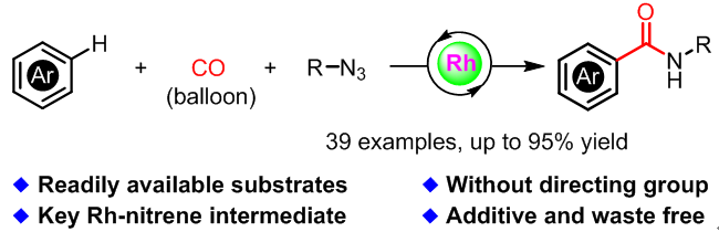 最近,他们发展了一种新型的羰基化策略,首次通过金属氮卡宾中间体实现了分子间C–H羰基化,高效、绿色地构建了酰胺类化合物。使用商业化的[Rh(cod)Cl]2为催化剂、常压下的CO作为羰基源、有机叠氮化合物作为氮源,实现了富电子(杂)芳烃的C–H酰胺化反应。氮气是反应的唯一副产物,反应具有原料易得、反应简单、条件温和、绿色高效等优点。通过控制实验和理论计算(与苏州大学鲍晓光课题组合作),他们提出可能是通过形成金属氮卡宾后和CO反应得到金属配位的异氰酸酯中间体实现的C–H羰基化反应。