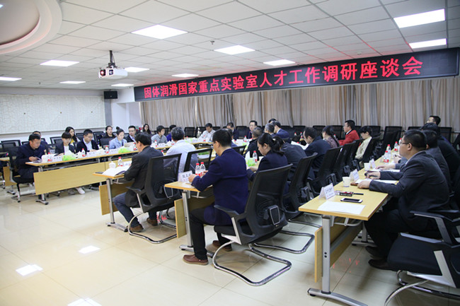 14日上午,调研组参观了固体润滑国家重点实验室,随后召开管理人员及科研骨干座谈会。兰州化物所所长、党委书记王齐华介绍了兰州化物所基本情况、人事人才和科学传播等工作。副所长周峰介绍了固体润滑国家重点实验室基本情况以及近年来实验室立足国家重大战略需求取得的成绩。副所长张俊彦介绍了兰州化物所近年来在吸引和稳定人才方面的主要举措和成效,同时也提出了困难和建议。中国科学院院士、固体润滑国家重点实验室学术委员会主任刘维民研究员和重点实验室科研骨干及研究所相关管理部门负责人先后发言,分别从实验室文化传承发扬、科研平台优势、科研人员的使命感与奉献精神等角度介绍了实验室取得优异成绩的关键因素,以及在人才稳定与培养方面的经验和做法,同时指出了实验室发展存在的主要问题和困难,提出了实验室今后的发展构想和建议。14日下午,分别召开了关键核心技术攻关及青年人才座谈会、科学家团队和典型人物事迹座谈会。与会优秀骨干分享了各自的成长发展经历和体会,以及实验室扎根西部、创新奉献的典型事迹等。