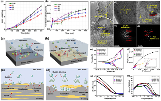 中国科学院兰州化学物理研究所磨损与表面工程和聚合物摩擦学课题组利用热喷涂技术,采用具有优异耐高温耐腐蚀性能的Ni基合金粉末,制备了相关耐气蚀涂层材料。揭示了涂层晶体结构演变、物相、组织改善对涂层在人工海水中耐气蚀能力提高的机理;研究了涂层表面形成的腐蚀膜与涂层气蚀性能的交互作用并进行了深入剖析;通过对涂层气蚀斑区域进行电化学测试,分析了气蚀损伤的电化学腐蚀作用机制。