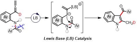 中国科学院兰州化学物理研究所羰基合成与选择氧化国家重点实验室夏纪宝研究员团队一直致力于惰性化学键的活化与转化研究。最近,他们在前期研究惰性C-N键选择性催化断裂(Org. Lett. 2019, 21, 1226; Chin. J. Org. Chem. 2018, 38, 1949)的工作基础上,实现了首例Lewis碱催化(亲核催化)的酰胺C-N键断裂重组的联烯胺-酰化反应。