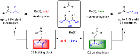 研究人员发现在碱性条件下,钌催化剂可以高选择性地催化甘油N-乙基氢氧基化。而当反应在酸性条件下进行时,甘油底物可以高选择性地转化为N‐丙酮基化产物。通过在酸碱条件下的切换,该催化体系可以将甘油转化为C2或C3构建单元,进而实现生物质甘油的高值化转化。该方法具有较好的底物兼容性,通过初步的机理研究如同位素标记、原位核磁等手段,研究人员提出反应可能是通过钌催化的借氢反应途径来进行的,而反应的酸碱性会影响醛中间体的retro-aldol反应过程,从而实现了对甘油作为羟乙基化试剂或丙酮基化试剂的调控。