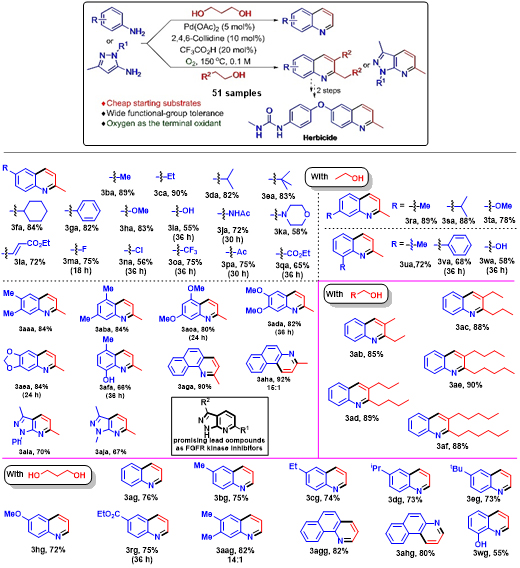 中国科学院兰州化学物理研究所羰基合成与选择氧化国家重点实验室蒋高喜团队利用乙醇、丙醇、1,3-丙二醇等简单脂肪醇和苯胺类化合物为起始原料,以廉价的Pd(OAc)2为催化剂,以氧气或空气为氧化剂,高原子经济性地合成了喹啉类化合物。