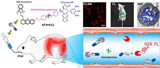 研究人员创新性地设计合成了一种新型的偶氮基前药AP-N=N-Cy,该偶氮基前药由前体药物分子(AP)通过多功能的偶氮苯基团与近红外荧光团(Cy)相连接而成。研究结果表明:该偶氮基前药不仅可作为对偶氮还原酶响应的近红外探针以实时示踪药物递送过程,而且还可作为抗癌药物分子(AdP)的递送平台。在偶氮还原酶存在的情况下,AP-N=N-Cy中的多功能偶氮苯基会发生断裂进而释放AdP和Cy,其偶氮苯基团充当了开启Cy荧光的开关,它的引入使得该偶氮基前药具有了独特的荧光开-关特性。基于偶氮还原酶会特异性地在结肠中分泌,该偶氮基前药实现了在结肠中特异性的定位递送与靶向释放。