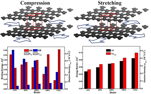 研究人员以典型二维结构石墨烯(Gr/Gr)、六方氮化硼(h-BN/h-BN)和二硫化钼(MoS2/MoS2)双层模型为载体,利用第一性原理研究了无层间堆垛失配的状态下二维结构层间相互作用随双轴应变的演化行为。结果表明:双轴拉伸有益于双层之间的垂直分离,而双轴压缩则有利于双层之间水平滑动。层间电子重分布程度的定量分析证实了层间电荷密度及其相对值的变化与双轴应变促进垂直分离和水平滑动密切相关:拉伸导致层间的电荷密度ρinter-降低,削弱了层间结合;而压缩导致了层间电荷密度的相对值Δρinter-降低,削弱了层间剪切强度。