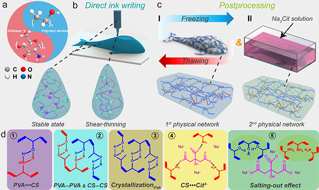 图1. 双物理交联策略构筑3D打印超高强韧水凝胶示意图