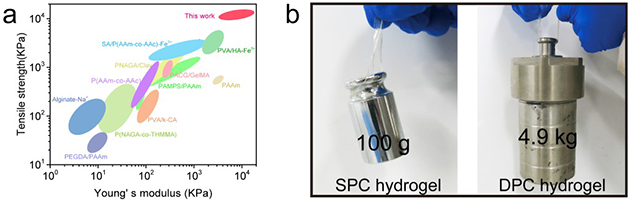 图2. 3D 打印双物理交联水凝胶力学性能与展示