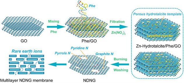 近日,中国科学院兰州化学物理研究所手性分离与微纳分析课题组开发了一种多重限域的一步可控合成掺杂方法,制备了对稀土离子具有高分离选择性的氮掺杂纳孔石墨烯膜(专利申请号:CN 202010861481.0)。研究人员在吸附了苯丙氨酸的氧化石墨烯膜的二维层间空间限域生长层状锌类水滑石,从而构建类水滑石/苯丙氨酸/氧化石墨烯三明治型复合材料。由于锌类水滑石层间夹层可以作为密闭反应器,通过限域燃烧,可将苯丙氨酸中的氮原子掺杂到石墨烯晶格中。与此同时,形成的多孔锌类水滑石又可以作为模板,通过孔区域内限域燃烧在氧化石墨烯上蚀刻出孔径可控的纳米孔(图1)。
