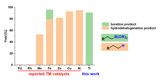 中国科学院兰州化学物理研究所羰基合成与选择氧化国家重点实验室吴立朋课题组一直致力于前过渡金属催化的烯烃、烷烃官能团化研究(Angew. Chem., Int. Ed., 2019, 58, 16167-16171; Angew. Chem., Int. Ed., 2020, 59, 13608-13612.)。最近,该课题组和夏春谷研究员课题组合作发展了前过渡金属钛催化的烷基卤代物和硼烷的直接硼化制备烷基硼酸酯类化合物的催化体系。该方法和已知的后过渡金属催化体系相比,可以有效抑制加氢脱卤副反应的发生(图一)。