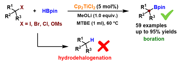 该研究中,研究人员发展了前过渡金属钛催化体系,实现了烷基卤代物和硼烷(HBpin, HBCat)之间反应制备烷基硼酸酯的方法,并且对反应机理进行了初步研究,揭示了一种可能的自由基反应途径。