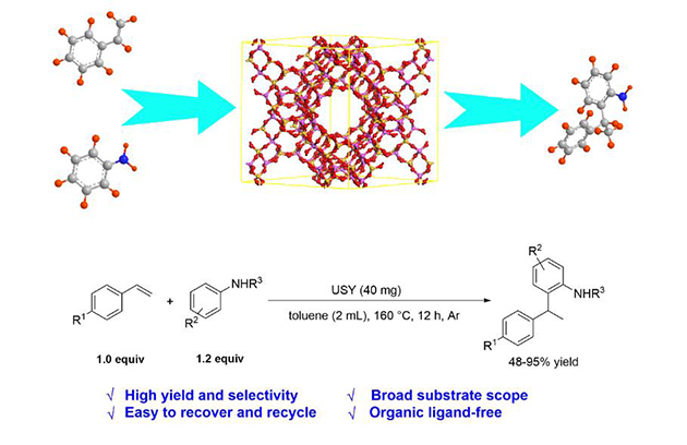 中国科学院兰州化学物理研究所羰基合成与选择氧化国家重点实验室石峰研究员课题组致力于多相催化的胺类化合物清洁合成的研究工作(Nature Commun., 2019, 10, 2059; Angew. Chem. Int. Ed., 2019, 58, 5251; Chin. J. Catal., 2019, 40, 1141; Nature Commun., 2018, 9, 1465; ACS Catal., 2018, 8, 3943)。最近,该课题组通过对分子筛酸性可控调节,发展了首例USY分子筛催化的苯乙烯与苯胺衍生物的选择性氢芳化反应(图一)。苯乙烯与苯胺的氢芳化单一产物的选择性可达85%。应用这种简单的催化剂体系,成功地合成了一系列氢芳化产物(40个实例,产率高达95%)。
