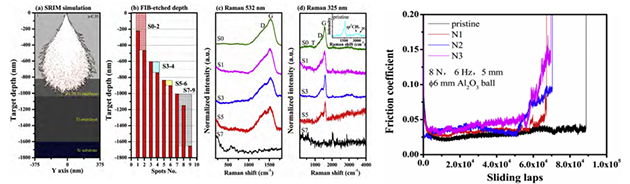 研究发现:DLC薄膜在重离子辐照过程中C-H键断裂同时伴随C由sp3向sp2杂化转变,氢的损失在非晶碳膜中产生悬挂键,增加滑动界面之间的粘附力;而碳的石墨化导致薄膜硬度降低,从而加剧滑动接触中薄膜润滑失效(Carbon, 2019, 146, 200-209; Surf & Interface Anal, 2020, 52,553-568;摩擦学学报, 2021, 41, 169-175)。