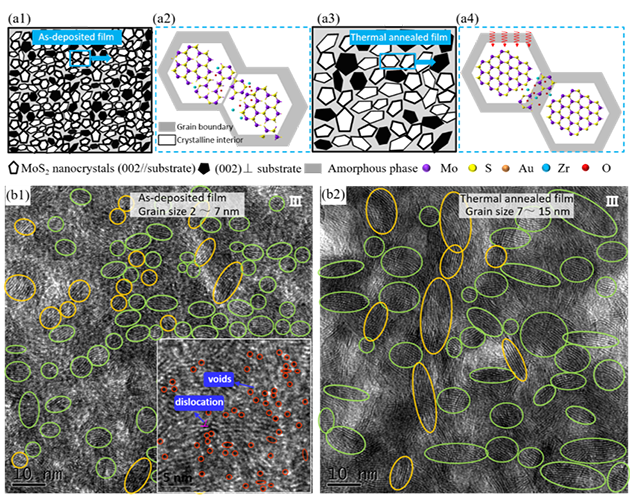 在此基础上,将反应堆结构材料抗辐照设计理念引入固体润滑薄膜优化,通过MoS2晶体结构控制与纳米化界面设计,该课题组首次成功制备了抗辐照与润滑自适应一体化的MoS2/YSZ基纳米复合薄膜材料。