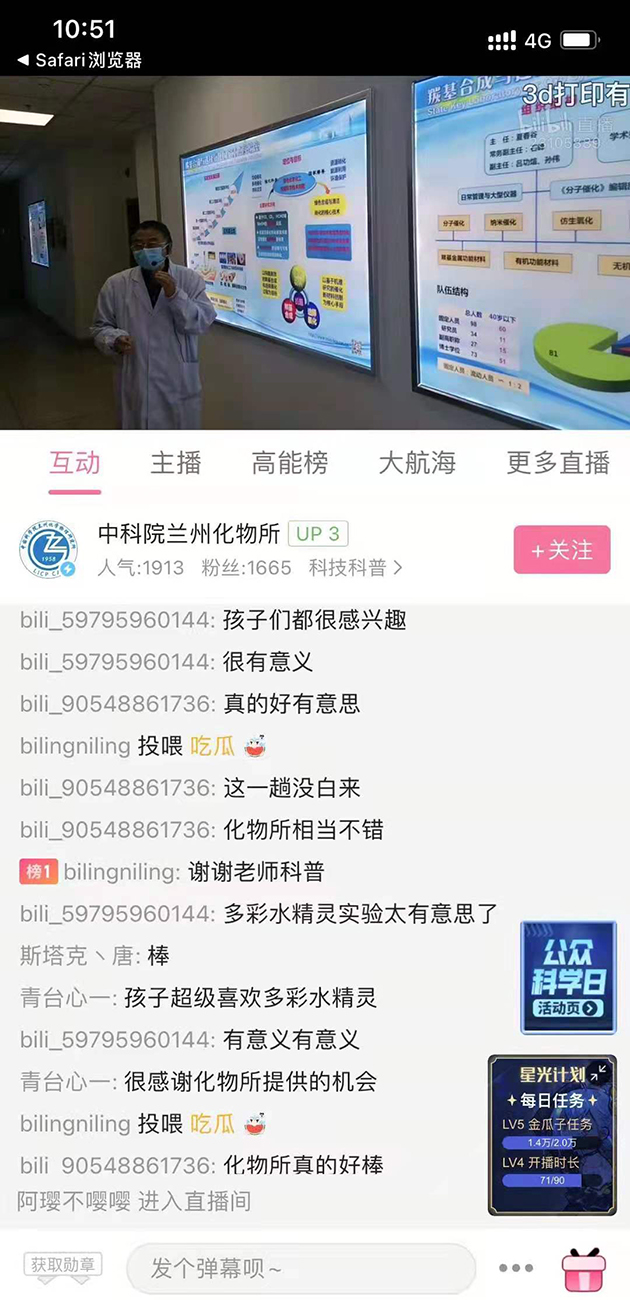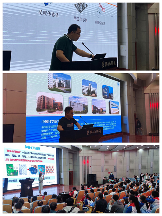 兰州化物所所长、党委书记主持科普报告会,并介绍了研究所公众科学日开展情况。中国科学院院士、兰州化物所学术委员会副主任委员刘维民研究员作了题为“高性能润滑材料技术助力现代化强国建设”的报告,介绍了润滑剂的作用、润滑油脂研究的重要性、航空航天润滑材料、高端装备润滑油脂、轨道交通润滑材料以及润滑科技工作者的使命,并勉励青年学生们爱国忠诚、责任担当、敬业奉献,思考总结、团结协作、创新实干,好好学习、提升科学和人文素养,努力担负起建设更加美好未来、美好中国的责任和使命。马立民助理研究员、高小龙研实员和宗莉高级工程师等青年科技工作者分别作了 “传感器——让生活更加智能” “碳中和与二氧化碳利用”“神奇的石头——认识世界、利用资源”的科普报告。