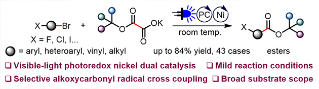 中国科学院兰州化学物理研究所羰基合成与选择氧化国家重点实验室夏纪宝研究员团队一直致力于羰基偶联反应的研究。近日,该团队实现了可见光/镍协同催化的卤代烃和草酸盐的选择性烷氧羰基化反应。