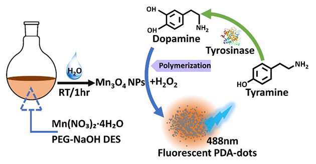 基于以上原理,研究人员在PEG-200与NaOH组成的DESs中加入硝酸铜,室温合成出Cu2(OH)3NO3纳米片。该材料表现出类氧化酶及类过氧化物酶活性,可用于生物硫醇的比色分析(Analytical and Bioanlytical Chemistry, 2020, 412, 4629)。随后,又成功制备出立方结构的Mn3O4纳米粒子,由于Mn3O4可将双氧水分解为羟基自由基,使多巴胺在羟基自由基的作用下最终生成具有蓝色荧光的聚多巴胺纳米点,从而实现多巴胺的荧光检测。同时,酪氨酸酶可催化酪氨为多巴胺,也可实现酪氨酸酶的选择性检测(图1)(ACS Applied Nano Materials, 2021, 4, 2820;专利申请号:CN 202110174492.6)。