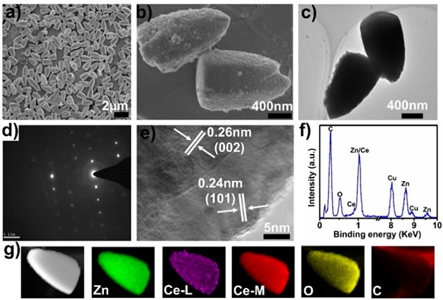 近期,该课题组将DESs结合溶剂热法,在不同温度下合成了子弹型的Ce-ZnO(图3)以及片层的Ce-Zn5(OH)8(NO3)2·2H2O材料。研究表明,子弹型的Ce-ZnO可在双氧水存在的情况下,催化双氧水产生羟基自由基,使多巴胺转变为粉色的醌类衍生物或具有蓝色荧光的聚多巴胺,导致体系在475nm处的紫外信号或480nm处的荧光信号显著增强。PPi可抑制Ce-ZnO的催化活性,使得体系的紫外或荧光信号随着PPi浓度的增加逐渐减弱,从而实现PPi的紫外或荧光检测。相关成果发表在 ACS Sustainable Chemistry & Engineering (2021, 9, 15147-15156)。Jean Claude Munyemana博士生为该论文的第一作者,陈佳副研究员和邱洪灯研究员为共同通讯作者。