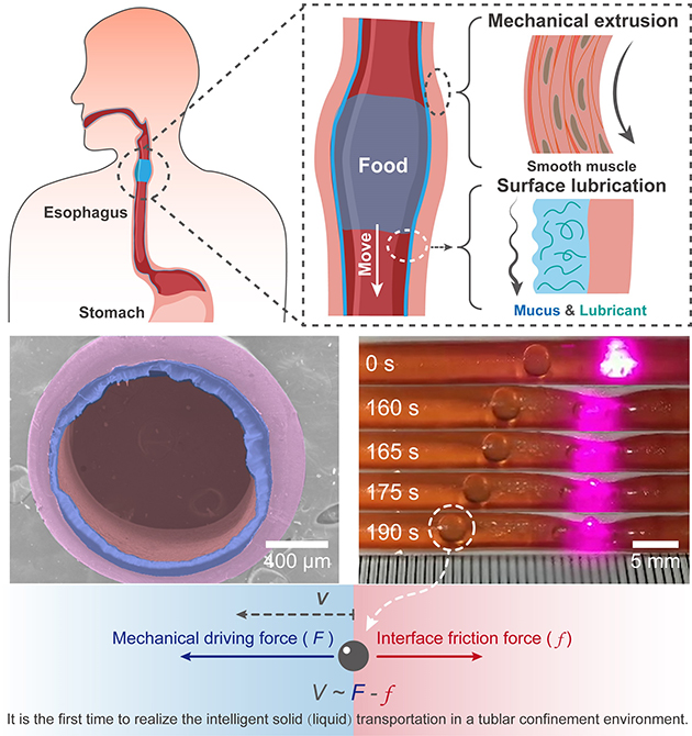 中国科学院兰州化学物理研究所固体润滑国家重点实验室周峰研究员团队从生活中找到了解决上述问题的策略。自然界中,在组织腔道分泌粘液的润滑作用下,食道能够利用肌肉应激产生的机械蠕动波实现大食块的成功传输。受此启发,研究人员基于界面润滑和机械变形的耦合效应,开发了一种智能型类食道凝胶软物质器件。在凝胶管内腔表面坚固的水润滑层辅助下,利用管腔收缩变形产生的流体动压和机械推动力实现了固体在多维方向的按需运输。相关结果发表在Advanced Science上。