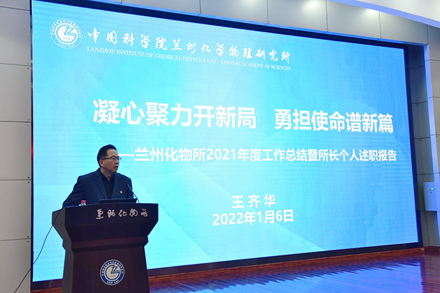 兰州化物所所长、党委书记王齐华代表研究所领导班子作了题为《凝心聚力开新局 勇担使命谱新篇》的报告,介绍了2021年研究所主要工作进展、机遇与挑战、2022年重点工作等。随后,王齐华作了2021年度党委书记述职报告,介绍了一年来党建工作开展情况,明确了2022年的工作思路。