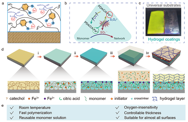 人口老龄化对植介入医疗器械提出了紧迫需求。在器械表面构筑亲水润滑涂层能够有效减小其与组织界面的摩擦力、降低手术操作难度、减小病人痛苦、延长器械使用寿命。水凝胶是一类具有典型湿滑特征的高分子材料,表面修饰水凝胶涂层可有效改变材料与器械表面的润滑特征。然而,现有的修饰方法普遍存在基材通用性差、涂层厚度不可控等问题。如何实现在通用材料和器械表面可控生长水凝胶润滑涂层,仍是该领域的科学难点。