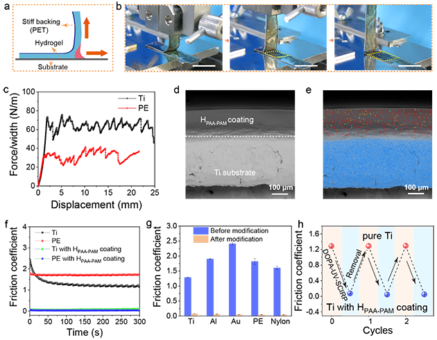 图3. 利用SIL@UV-SCIRP方法生长得到的水凝胶涂层与基材的结合力和润滑性能评价
