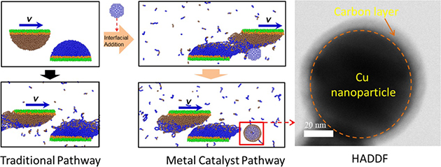 研究人员采用“摩擦+催化”结合的方法,建立了不依赖薄膜沉积工艺,通过外部“催化”调控摩擦的新体系(图1)。利用金属催化作用在碳膜摩擦界面形成石墨烯包裹的金属颗粒。同时,石墨化外壳起到电子屏蔽效应,消除界面粘附强度,实现了宏观超滑(~0.008)。石墨化包裹和电子屏蔽是摩擦催化诱导超滑产生的本质原因,也是判断催化导致超滑实现的主要依据。