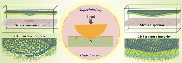 研究人员利用类富勒烯碳膜超弹性,设计了基于微观尺度接触应力分散,实现了高承载超滑的新型摩擦配伍体系(图2)。超弹性分散了施加于二维材料上接触应力,避免应力集中引起的二维材料起皱、褶皱或结构破坏,维持二维材料结构完整,并减弱了环境化学作用,最终实现了高承载(15 N)、环境稳健(RH~40%,~0.009)、宏观尺度超滑。超弹性配副解决了结构超滑低承载和环境敏感等问题,对推动超滑新概念技术和工程应用具有重要意义。