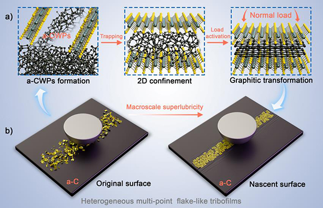 研究人员提出摩擦限域调控能量耗散的方法,即通过利用磨合期高能量,促进摩擦限域化学发生和结构演变,实现了稳态近零能量耗散(图3)。具体为:引入二维层状材料(过渡金属硫属化物)到碳膜摩擦界面上,将碳膜磨损产物(a-CWPs)裹入二维材料层间,形成TMDC/a-CWPs夹层结构;基于剪切诱导二维限域和载荷驱动石墨化的协同作用,夹层结构在磨合阶段很容易转变为石墨烯/TMDC异质结构,最终实现稳态宏观超滑(~0.006)。