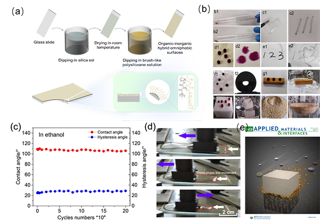受猪笼草启发的在多孔或纳米结构表面中封存低表面能润滑剂的“超滑”材料近年来成为研究热点。但这种“超滑”表面因存在纳米结构表面耐磨性差,润滑剂分子通过弱范德华力吸附于表面从而易损失,导致耐久性差。针对这一问题,研究人员制备了带有“锚固”基团的润滑剂 “刷”状大分子,将传统润滑剂分子通过化学键锚固于光滑表面。同时,引入无机中间层增加键合强度,大大提升了表面耐磨性和耐溶剂浸泡特性。在100kPa压力下,往复摩擦3万次表面润湿特性几乎保持不变;同时具有普适性,在各种基底均可修饰(Prog. Org. Coat., 2021, 154, 106171)(图1a-b)。