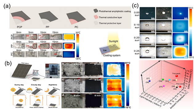 受荷叶启发的超疏水材料具有明显防除冰效果,但在低温高湿度环境下,超疏水防除冰效果丧失,而机械除冰会破坏涂层微结构进而破坏其超疏水特性。针对这些问题,研究人员利用氟化碳纳米管和工程化丙烯酸树脂制备超双疏涂层,利用碳纳米管可见光-热效果,实现了该超双疏涂层在太阳光下的自主加热防冰、除冰。通过光热层-导热层-绝热层的多层设计,提升了放热除冰效率,在太阳光照射涂层部分区域即可实现全表面防除冰,避免了除冰时的机械破坏(ACS Appl. Mater. Interfaces, 2020, 12, 46981)(图2a)。利用碳纳米管的电热效应,赋予表面光热、电热复合“1+1>2”效果,实现了涂层白天利用光、夜晚利用电的全天候热防除冰(Adv. Mater. Tech., 2021, 6, 2100371)(图2b)。为避免光热量损失,研究人员利用冰模板法制备了大孔状超疏干凝胶,利用该材料多孔隔热性质,将光热量聚集于光辐照区域,大大提升了材料光热性能,在-30℃环境下,0.25倍太阳光下即可实现材料表面的永远不结冰(ACS Appl. Mater. Interfaces 2021, 13, 37609)(图2c)。
