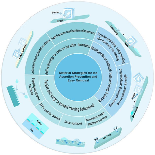 基于以上工作,受ACS Materials Letter期刊邀请,该团队撰写了题为“Material Strategies for Ice Accretion Prevention and Easy Removal”的综述文章(ACS Mater. Lett. 2022,4, 246-262)(图3)。从材料技术角度总结了被动防冰、主动除冰及主被动结合的三种防除冰策略。