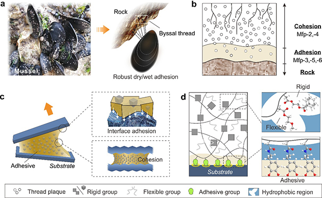 黏附材料在工程材料领域有非常重要的应用,然而在高强度、高湿度(水下)的应用环境中(渔船、游船、划艇、潜艇等),水分子极易破坏胶黏剂的黏合界面,导致功能失效。市面上现有的大多数胶黏剂水下黏附强度低、耐水性弱,无法满足长期的水下应用需求。因此,开发具有较强界面黏合力、耐水性和机械耐受性的黏附剂是工程应用和技术领域的挑战之一。