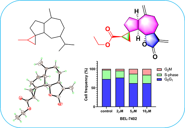 这是首次从甘松中分离鉴定了含有α-亚甲基-γ-内酯基的倍半萜结构,该片段被认为是抗肿瘤活性基团。Narjatamolide可抑制肝癌细胞株BEL-7402、HepG2和Huh-7以及宫颈癌细胞株HeLa的增殖(IC50 = 5.67 ± 1.43, 21.84 ± 1.62, 25.5 ± 3.14, 15.46 ± 0.69 μM)。进一步研究发现该化合物可将BEL-7402细胞周期阻滞在G2/M期(J. Org. Chem. 2021, 86, 11006)。